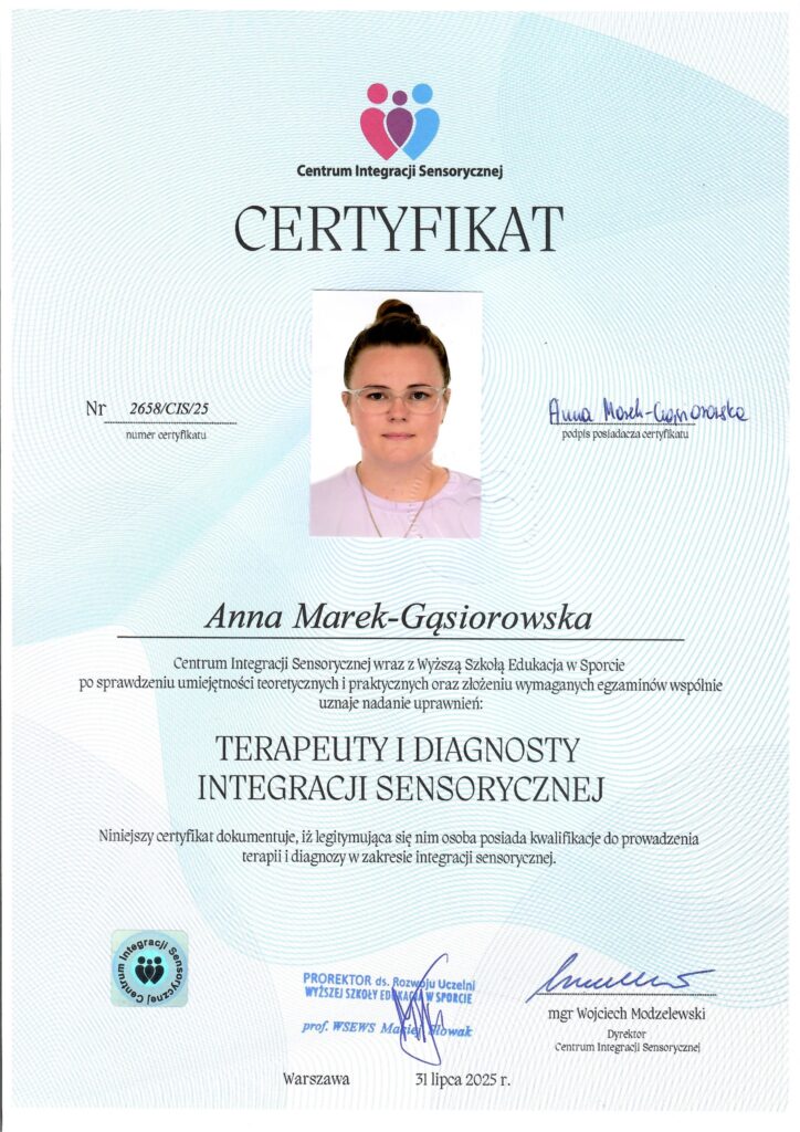 CERTYFIKAT – TERAPEUTY I DIAGNOSTY INTEGRACJI SENSORYCZNEJ